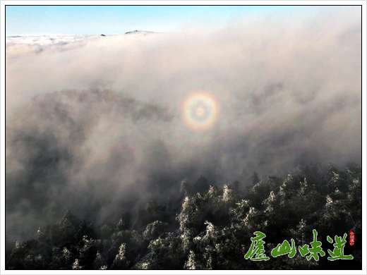 高空俯瞰下,海拔1474米的庐山最高峰——汉阳峰雾凇沆砀,高达76米的广播电视发射塔巍然矗立,云雾奔涌如仙境。远处仰天坪、大月山在云涛中显露峰峦,成为茫茫云海中难得一见的地面参照物。更为神奇的是,在云幕之上出现了无人机投射出的彩色日晕,物动影亦动,雾消影亦消,光怪陆离,景象瑰丽。